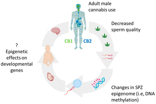 Δ9-THC exposure during pregnancy has several adverse outcomes, such as low body weight at birth [95], but also developmental and behavioral troubles particularly neurodevelopmental, musculoskeletal, and cardiovascular defects, or deregulation of innate and adaptive immune system, or congenital/teratogenic defects in children [96,97,98,99,100,101,102]; however, the ability of cannabis to heritably impact the sperm epigenome is poorly studied, but highly relevant.