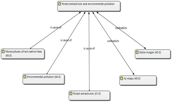 In the coding process, the categories “forest extractivism and environmental pollution” were developed, which were related to the subcategories “Monocultures of non-native trees”, “Environmental pollution”, “Forest extractivism”, “Az mapu” and “Küme mogen”. These subcategories were carefully quantified (see Appendix A) based on the participant interviews, allowing the identification of numerical patterns that facilitated the identification and saturation of the subcategories [,].
