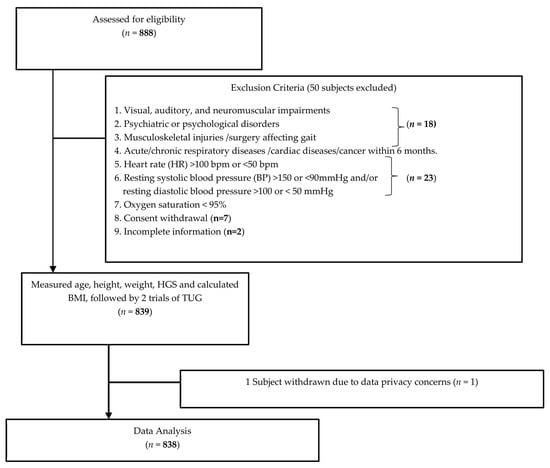 Tan, T.C.; Guo, Y.Y.; Ho, D.J.; Sanwari, N.A.B.; Quek, P.H.; Tan, R.S.; Yap, F.S.; Yang, M.; Yeung, M.T. Reference Values, Determinants and Regression Equation for the Timed-Up and Go Test (TUG) in Healthy Asian Population Aged 21 to 85 Years. Int. J. Environ. Res. Public Health 2023, 20, 5712. https://doi.org/10.3390/ijerph20095712
