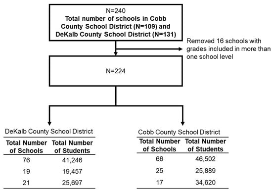 Statistical Analyses. Table 1 lists the variables used and the data sources. County measures included race and ethnicity (Black, White, Asian, Hispanic), population over three years old enrolled in a public school, and uninsured people; these variables were obtained from the U.S. Census Bureau []. District level variables included race and ethnicity (Black, White, Asian, Hispanic), number of schools in each school level, number of students within each school level, average school size, average student-to-teacher ratio, and average free or reduced lunch. Race, ethnicity, student-to-teacher ratio, and average free or reduced lunch data were obtained from the National Center of Education Statistics []. The chi-square test was used to compare the categorical county and school district measures, and t-tests for continuous variables for the DeKalb versus Cobb counties and school districts.