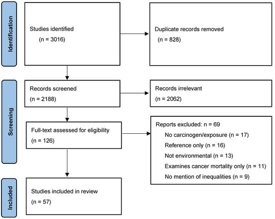 For this scoping review, we searched both PUBMED and SCOPUS for articles on 6 October 2021 with no restrictions for dates. The search terms were environment * AND (inequ * OR dispari *) AND (cancer OR carcinogen). All articles were imported into Covidence, which is online software that streamlines the review process. Inclusion criteria selected for articles written in English, that were not review articles, that examined carcinogen exposure/environment or cancer outcomes not including mortality, that mentioned inequalities or disparities, that were environmental in nature (i.e., not occupational), and that took place in Canada, the United States, New Zealand, Australia, or western Europe. While occupational exposures are undoubtedly an important route of exposure, they were beyond the scope of this review, as the focus was on exposures in the environment.
