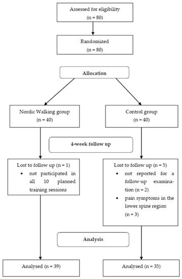 The subjects, who in the previous therapeutic management were recommended to sustain its effects by maintaining moderate PA, were divided by randomization into two groups: experimental and control. The subjects were randomly divided into groups by a person who neither participated in the study nor conducted the planned walking training. People qualified for the study drew cards with the names “NW” (group undergoing NW training) and “K” (control group). The subjects who qualified for the control group were also offered to participate in NW training, but after the end of the experiment. The surveys and the modified Fullerton Functional Fitness Test (FFFT) were performed in both stages of the experiment by people experienced in performing such tests, who, however, did not know the purpose of the study or the division into groups.