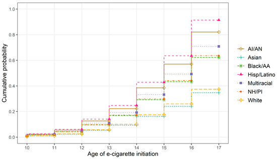 Unweighted and weighted sample characteristics are provided in Table 1. The percentages of e-cigarette use across racial/ethnic groups by grade level are provided in Table 2. The results of the logistic regression models examining racial/ethnic differences in lifetime and past 30-day use are reported in Table 3 and Figure 1. The results indicated that youth reporting different racial/ethnic groups also reported significantly different rates of lifetime and past 30-day e-cigarette use. Compared to White youth, AI/AN (OR = 2.37, 95% CI [1.92, 2.93]), Black/AA (OR = 1.94, 95% CI [1.63, 2.30]), Hispanic/Latino (OR = 3.14, 95% CI [2.84, 3.47]), Multiracial (OR = 2.12, 95% CI [1.93, 2.33]), and NH/PI (OR = 1.88, 95% CI [1.51, 2.35]) youth had a significantly higher likelihood of lifetime e-cigarette use. Compared to White youth, AI/AN (OR = 1.47, 95% CI [1.08, 1.99]), Black/AA (OR = 1.38, 95% CI [1.03, 1.84]), Hispanic/Latino (OR = 2.03, 95% CI [1.71, 2.40]), Multiracial (OR = 2.13, 95% CI [1.76, 2.57]), and NH/PI (OR = 1.51, 95% CI [1.12, 2.04]) youth had a significantly higher likelihood of past 30-day e-cigarette use. Asian youth (OR = 0.63, 95% CI [0.47, 0.84]) had a significantly lower likelihood of past 30-day e-cigarette use compared to White youth. The cumulative probabilities from a Cox proportional hazards model for e-cigarette use initiation by race/ethnicity are reported in Table 4 and plotted in Figure 2. Hispanic/Latino youth showed the highest probability of e-cigarette use initiation at each age.