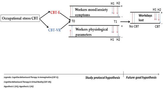 Taking into consideration previous literature evidence where metanalyses [26,36] have underlined the greater effect of CBT on occupational stress both on psychological and physiological outcomes than other techniques as relaxation or organizational protocols, we expect a global positive influence of both CBT practices on workers’ mental health outcomes in term of a reduction of mood and anxiety symptoms, as well as a reduction of the physiological stress response (heart rate, respiratory rate, skin conductance, and body temperature) at the end of the whole training (Hypothesis 1). Nevertheless, the single term of the impact is unpredictable because the literature studies are very heterogenous. We hypothesize a greater efficacy from the CBT-VR because the rehabilitation program will be focused on imaginative techniques with gradual desensitization, and it is assumed that VR will allows a better immersive experience. In this regard, we predict greater levels of the physiological parameters during the first session of CBT-VR, as well as greater reduction during the last session with respect to CBT-E (Hypothesis 2). Further, regarding the future application of the method, we believe that work stress disease rehabilitation with CBT-VR could have a better impact in terms of the reduction of workdays lost in line with the improvement of clinical parameters and a better modulation of stress physiological parameters (Hypothesis 2). See Figure 1.