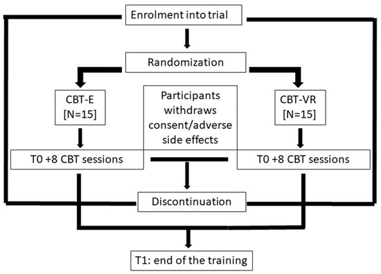 A total of 30 patients will be allocated to either CBT-E or CBT-VR. We opted for 15 patients for each group. Based on a sample of 100 healthcare workers of our University Hospital suffering from Adjustment Disorders and treated with CBT at our center (pre-treatment CGI score = 3.95 ± 0.74 and post-treatment CGI score = 2.39 ± 1.07, unpublished data), to point out a difference between the 2 treatment groups (CBT-E and CBT-VR) of at least 1 point at the CGI, the estimated sample size should be at least 26, with 13 patients in the CBT-E group and 13 patients in the CBT-VR group (by considering confidence interval = 95%, statistical power = 90%, ratio of sample size of 1).