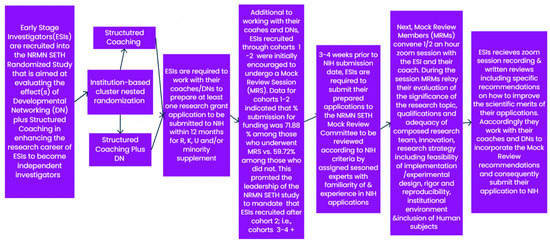 Our study has thus far recruited 210 ESI participants since 14 December 2019, through four cohorts sequentially recruited over time. ESIs are required to work with their coaches and developers (for those randomized to the coaching plus DN group) and submit at least one NIH extramural application for funding within the first 12 months of their enrollment in the program. MRS were optional for cohorts 1–2 and became mandatory starting July 2020 for subsequent cohorts. Figure 1 illustrates the interfacing of the flow of the study design with the inclusion of the MRS process.