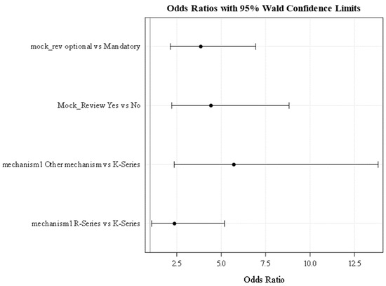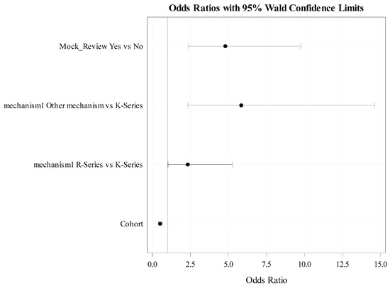 In a mutually exclusive iterative process, we also tested cohort effects and MRS period (optional vs. mandatory). To accommodate the effects of multiple applications per ESI, additional analyses used conditional logistic regression principles to test for these effects using ESI as a cluster variable. Results are visually demonstrated using odds ratio graphs. Generally, for these graphs (c.f., Figure 2 and Figure 3 in the results section), each solid line with whiskers at the end and a dot in the middle represents the point and interval estimate (magnitude) of the Odds Ratio(s) (OR) of the outcome when comparing two subgroups of a particular independent/predictive factor (in Figure 2 for example, the dot in the middle of the top solid line represents the estimated (from the data) odds (likelihood) of applying for extramural funding for the subgroup that underwent MRS when it was optional (cohorts 1–2) divided by the corresponding odds (likelihood) of those who underwent MRS after it became mandatory (cohorts 3 + i.e., the reference subgroup). The length of the solid line in those graphs for each comparison shows the width of the 95% confidence interval of the “population” odds ratios (i.e., the range that the OR can take in the underlying population of such data). As long as the solid line does not include the value “1” (which represents equality of the two compared odds) that means the ratio of the two odds are not the same (i.e., statistically significantly different from “1” at a 0.05 significance level). The overall significance level for the test of hypotheses was set at 0.05 with provision for multiple comparisons adjustment when needed. Statistical analyses were conducted using SAS version 9.4 and R version 4.2.2