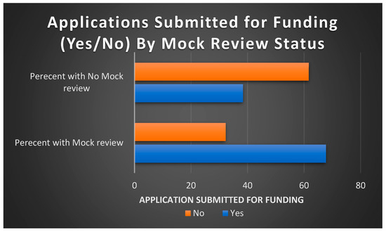Table 3 and Figure 3 indicate that when comparing applications that went through MRS (n = 62) versus those that did not (n = 172), 42 (67.7%) vs. 66 (38.4%), respectively, were submitted for extramural funding. The corresponding comparisons for applications that were awarded funding were 19.35% vs. 24.42% (8 (8.6%) of the submitted applications are still pending decision outcomes from their funding agencies/entities). Table 3 further gives frequency distributions of submitted/awarded applications by MRS period, sought mechanism of funding and recruitment cohorts.
