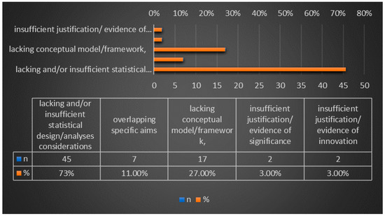 The most prevalent issues (not necessarily mutually exclusive, i.e., some may overlap with each other) that were detected by the MRS were distributed as follows: 45 (75%) lacking and/or insufficient statistical design considerations and statistical analyses plan (SAP) (e.g., missing/generic sample size and statistical power justifications, and lack of clarity identifying outcome measures and covariates/confounders/predictors of outcome), 17 (28.3%) lacking conceptual model/framework, 7 (11.7%) with overlapping specific aims, 2 (3.3%) with insufficient justification/evidence of significance, and 2 (3.3%) with insufficient justification/evidence of innovation (Figure 5).