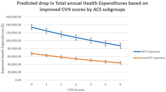 Figure 1 shows that improvements in CVH scores predict lower annual healthcare expenditures for both ACS and non-ACS cohorts; however, this is to a greater degree percentage-wise for ACS. These findings are consistent with other researchers who have demonstrated that an improved CVH profile or LS7 score is associated with significantly lower total medical expenditure and healthcare utilization in a large, young, ethnically diverse population [].