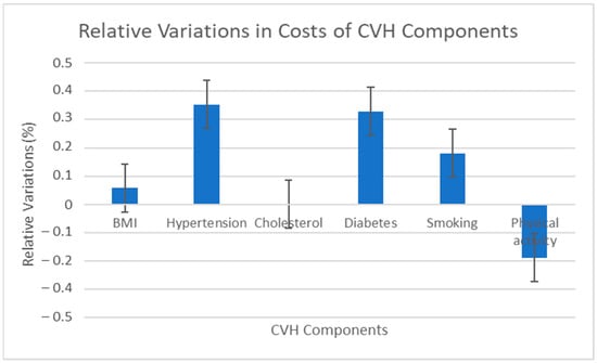Figure 3 below shows the variations in the impact on the level of expenditure for all CVH components. Meanwhile, achieving a normal BMI generates an annual variation of less than 6% and hypertension causes the highest variation in total healthcare expenditures (35.3%), closely followed by diabetes mellitus with 33% at p < 0.05. Inadequate physical activity and achieving normalized serum cholesterol levels had the least impact on expenditures, with −19% and 0.1%, respectively, at p < 0.05. These findings were consistent with the results of other researchers. For example, in Australia, scientists demonstrated that obesity, hypertension, and diabetes mellitus are predictors of higher pharmaceutical expenditure among persons with or at risk of CVD [].