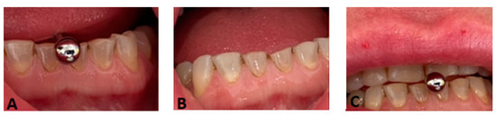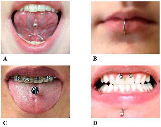 Escudero-Castaño et at. distinguish four different types of piercing in the oral cavity: “the barbell”; “the labret”, which is made up of a metallic bar, straight or curved, with a sphere or other geometric figures or jewels at the extremity (Figure 1A–C) [17]; an open-ring ending with a single extremity or double extremity sphere (Figure 1D); and a type in which a powerful magnetic force holds the two studs together [17,18].