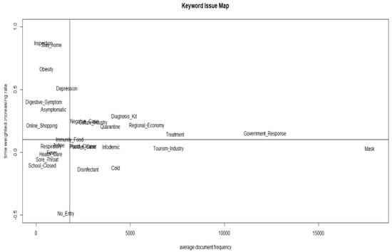 - “{1 − tw × (n − j)}” is a function that weakens its influence as time passes, thus determining the scale of the time weight [37]. Keyword emergence map (KEM) and Keyword Issue Map (KIM) were examined by visualizing the frequency of emergence and the time-weighted rate of the increase in topics [35,37].
