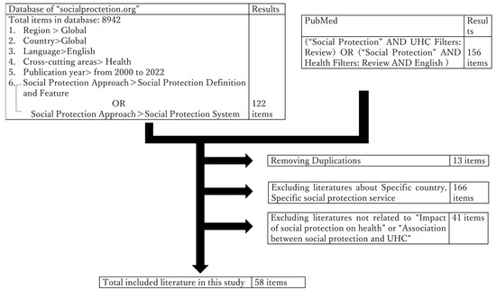 We searched the literature on the associations between social protection and UHC using PubMed for English-language articles published before September 2022. The search strategy followed the Preferred Reporting Items for Systematic Reviews and Meta-Analyses (PRISMA) guidelines and was performed using the following search terms: “social protection” and “UHC” or “social protection” and “Health”. In order to capture information from international entities, we searched the publications by international organization through the database “socialprotection.org” at the address https://socialprotection.org/discover/publications, access on 1 October 2022. “socialprotection.org” is an online member-based knowledge-sharing and capacity-building platform established in 2015 to respond to a recommendation from the G20 Development Working Group. The database “socialprotection.org” provides the most up-to-date and comprehensive content on social protection, with a focus on low- and middle-income countries. The detailed search strategy employed on “socialprotection.org” is shown in Figure 1. In order to follow the global discussions about social protection and UHC in health sectors, we searched all WHO resolutions and decisions in the world health assembly for the past 10 years from 2013 to 2021 [17,18,19,20,21,22,23,24,25,26,27] and the main documents of agenda with UHC in the title.