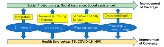 Regarding entitlement, social protection and health systems should be appropriately designed to ensure the entitlement for people in need, including targeting, registration, contents of benefits and services, and the necessary resource allocations. The partial integration of these measures between social protection and health services may contribute to the improved coverage of both. In the long run, a well-functioning civil registration system should be established to promptly identify expected recipients of services. Concerning accessibility, information on entitlements to benefits and services should reach vulnerable populations in a way they can comprehend. In order to address a range of barriers, including social, cultural, language, administrative, and navigators, or cultural mediators, such as peer workers, community leaders, volunteers, and consultation services, could play a major role in improving awareness among the populations and referring them to necessary service delivery points. These navigators or cultural mediators should be able to improve access not only to a single service but also a variety of services across social protection and health services, maximizing the opportunity. At the point of services, the responsiveness to the needs of recipients should be considered for interventions. As vulnerable populations tend to have complex psychosocial problems, including traumatic experiences using services, service delivery should be designed to be sensitive and friendly for vulnerable populations. The experiences of a single program in delivering vulnerable population-sensitive and friendly services should be shared and replicated across social protection and health services. Lastly, measures to promote changes include involving vulnerable populations in program management, monitoring and evaluation, research and advocacy, multi-sectoral coordination at central and local levels, and solidarity including social and solidarity economy (SSE) [87]. Advancement in each of these measures should be cross-fertilized across social protection and health services to maximize the expected outcomes, including coverage. Some of these synergies for vulnerable populations are observed in addressing specific health issues, such as tuberculosis, HIV, and COVID-19. Towards achieving UHC, these experiences should be replicated and expanded to address a wide range of health needs in a comprehensive manner.