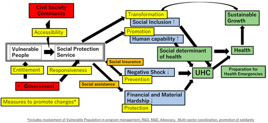 The EU and OECD consider social protection as an efficient factor in pro-poor economic growth [63]. By adopting the social protection measures proposed by Devereux et al., the EU, and OECD propose that the roles of social protection can be sorted into four categories: protective, preventive, promotive, and transformative functions, in terms of how they progress the reduction of the vulnerability of the poor [81]. Ji-Yeun Rim et al. discussed the association of social protection with UHC [82] in the context of this framework: (1) Protective measures in income and in-kind transfers alleviate financial and material hardship experienced during illness and can complement the existing healthcare cost subsidies through social assistance services. (2) Preventive measures can prevent negative health impacts through wider social insurance. (3) Promotive measures can improve human capability by contributing towards livelihood assets and empowerment through education, training, and employment. These interventions can facilitate the access and utilization of health services through increased financial, human, and social capital. (4) Transformative measures promoting social inclusion and women’s empowerment can have a metamorphosing power, which can contribute towards barriers to access and utilization. This may include empowering trade unions to provide a voice for the vulnerable, launching public awareness campaigns seeking to change broader attitudes within the society, or implementing policies that specifically empower women.
