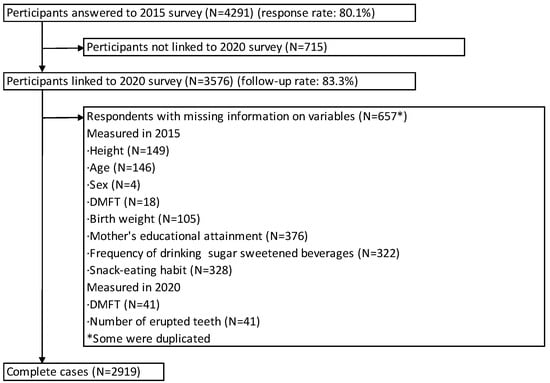 Data from the Adachi Child Health Impact of Living Difficulty (A-CHILD) Study, a longitudinal study of all 69 public elementary school children in Adachi City, Tokyo, Japan, were analyzed [15]. Figure 1 shows a flowchart of the study participants. In 2015, a questionnaire was distributed to the caregivers of all first-graders in the city (N = 5355). Of these, 4291 (response rate: 80.1%) answered the questionnaire and submitted to the school using anonymous envelopes. In the same year, children’s height and dental caries were measured as part of school health checkups and linked with the survey data. The follow-up survey was conducted at grade 6 (N = 3576, follow-up rate: 83.3%) in 2020. The number of complete cases was 2919, after excluding 657 participants with missing information on variables used in the analysis, including the height of children at grade 1 (N = 149), age (N = 146), sex (N = 4), dental caries in permanent teeth at grade 1 (N = 18), dental caries in permanent teeth at grade 6 (N = 41), birth weight (N = 105), the mother’s educational attainment (N = 376), the frequency of drinking sugar-sweetened beverages at grade 1 (N = 322), snack-eating habits at grade 1 (N = 328), and the number of erupted permanent teeth at grade 6 (N = 41). All caregivers (parents or legal guardians) provided written informed consent to participate in this study. This study was approved by the Ethics Committee of the Tokyo Medical and Dental University (M2016-284), Tokyo, Japan, and the National Center for Child Health and Development, Tokyo, Japan.