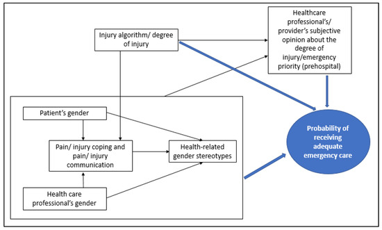 Regarding the influence of social gender and existing gender stereotypes on the likelihood of receiving appropriate emergency care, it can be concluded that male patients with a comparable level of injury are more likely to receive the highest priority level of prehospital care than women and are significantly more likely to be transported from the scene to a trauma center [34,48,49]. Women with, for example, suspected myocardial infarction show significantly longer total ischemic time and correspondingly less favorable outcomes (e.g., in terms of mortality) because of low prioritization within prehospital care [55].