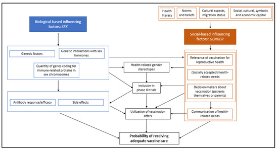 While vaccination utilization is influenced by the category of gender, there is also an impact of biological aspects in vaccine delivery—related to efficacy and potential side effects. Study results suggest that women develop higher antibody responses to many vaccines compared to men, and that the variables of age and sex interact in predicting vaccine response [74,75]. For example, higher levels of estrogen may contribute to an enhanced vaccine response in women, while testosterone correlates with an attenuated vaccine response, e.g., in influenza vaccination [76]. Genetic factors and their interactions with sex hormones are also associated with this sexual dimorphism in immunological response: there are about ten times more genes on the X chromosome than on the Y chromosome, including a large proportion of genes coding for immune-related proteins [77]. Females therefore have higher expression of immune-related genes and proteins that can interact with sex hormones to enhance an immune response [75]. In principle, gender-specific differences in antibody response (and thus related to efficacy) depend on the particular vaccine. Women of older age have higher antibody responses to influenza vaccines than men of the same age. Men of older age, in contrast, show a higher clinical efficacy with the pneumococcal vaccine, as well as with the diphtheria, tetanus and pertussis (combination) vaccines [78]. This contrasts to reports in younger adults, where women have higher antibody titers than men in response to live, subunit and inactivated attenuated vaccines—including pneumococcal, influenza, yellow fever, rubella, measles, mumps, hepatitis A and B, herpes simplex 2, rabies, smallpox and dengue vaccines [78,79,80]. COVID-19 vaccines were shown to be more effective in males in most pivotal (phase III) trials. However, age stratification was not used in most of these studies [75].