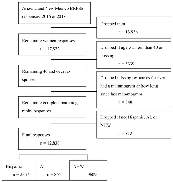 Inclusion criteria were women aged 40 or older who were Arizona or New Mexico residents. Exclusion criteria were eligible women with missing responses to the questions ‘Ever had a mammogram’. Also, women who did not identify as NHW, Hispanic, or AI were excluded. See Figure 1 below.