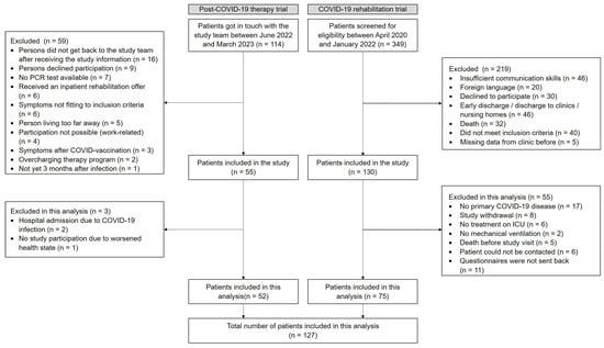 In the post-COVID-19 therapy trial (non-hospitalized individuals), 114 individuals were screened between June 2022 and March 2023. A total of 55 were included in the trial, and 52 were enrolled in this analysis. In the COVID-19 rehabilitation trial (hospitalized individuals), 349 patients were screened between April 2020 and January 2022. A total of 130 were enrolled in the study from June 2020 until January 2022, and 75 were included in this analysis (Figure 1).