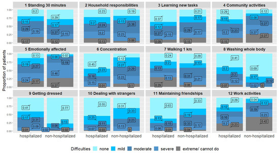 Difficulties in basic physical tasks such as washing and getting dressed were more frequently reported by hospitalized persons. However, more exhausting physical tasks such as walking for one kilometer, household responsibilities or standing for longer periods led to similar difficulties in both groups. Dyspnea was comparable in both groups. Concentration was more impaired in the non-hospitalized individuals. Social activities and participation were also more affected in the non-hospitalized group, and work activities and joining in community activities especially led to severe difficulties in this group (Table 3, Figure 2). However, although the burden of symptoms seemed higher in the non-hospitalized group, most of the hospitalized individuals were also substantially impaired, as two thirds had either a moderate or a severe disability (as measured by the WHODAS-12).
