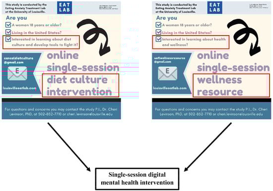 This study was approved by the Institutional Review Board of the University of Louisville. The current study was part of a larger single-session DMHI study testing the efficacy of the intervention in terms of decreasing ED pathology and weight stigma concerns, as well as improving body image and fat acceptance. Individuals were recruited through social media platforms (e.g., Instagram), the research laboratory’s website, and an undergraduate student research portal. In recruitment materials, the intervention was framed either as a Diet Culture Intervention or a Wellness Resource (see Figure 1). Individuals were eligible to sign up for the study through one of the two framings. Recruitment materials for both framings were posted on all recruitment outlets, though these framings were not advertised as being associated with the same study and individuals therefore were not guaranteed to see both framings. If an individual attempted to enroll in the study through both the Diet Culture Intervention and Wellness Resource framings, they were asked which one they would prefer to complete and provided the link to the selected framed intervention.