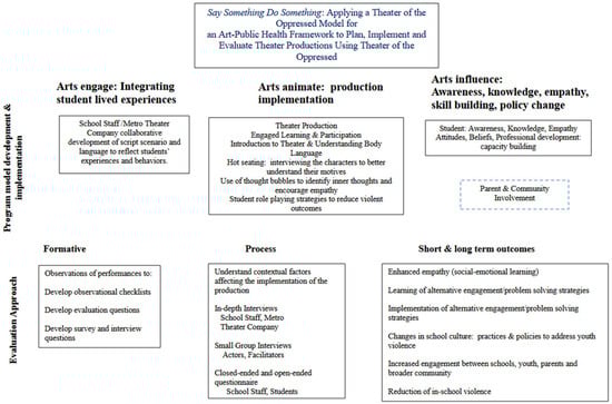 Our evaluation strategy integrated arts-and-health promotion evaluation models into a framework that may be useful for others searching for ways to understand the effects of arts-based projects focusing on a range of social issues, health behaviors, and social determinants of health. Using an arts-based and public health evaluation framework facilitated our knowledge about how this production, as a model, served as an entry point for longer-term arts-based violence prevention efforts within school settings. Forum theater, as an application of participatory theater, is part of a continuum of community engagement strategies using drama to promote health and well-being. This is an important engagement strategy within public health that can help youths recognize and develop their own strengths in managing challenges that they encounter.