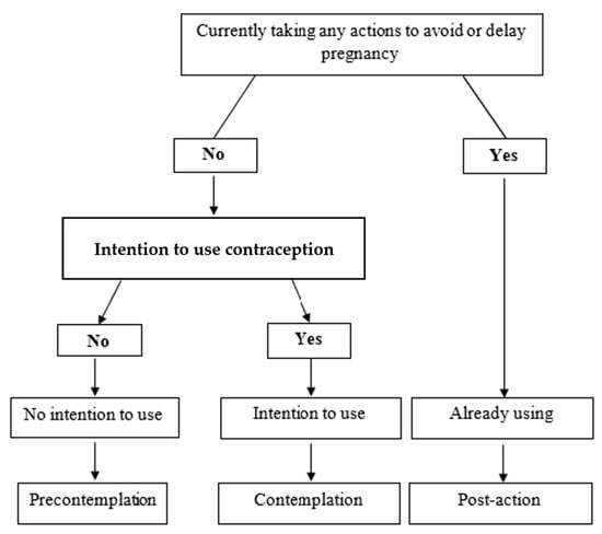 Those who answered “no” were further asked, “You said that you are not currently using a contraceptive method. Do you think you will use a contraceptive method to delay or avoid getting pregnant at any time in the future?”. As shown in Figure 1, those who responded with “no” were classified as being in the precontemplation stage (no ITU). Those who answered “yes” were classified as being in the contemplation stage (ITU). Motivational readiness was modeled as a 3-level outcome variable.