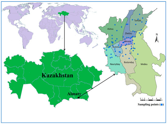 The study area was Almaty City, the former capital of Kazakhstan, in the southeastern part of the country between 43°16′39″ north latitude and 76°53′45″ east longitude (Figure 1). It consists of eight districts (Alatau, Almaty, Auezov, Bostandyq, Medeu, Nauryzbay Turksib, and Zhetisu). The area is located about 500 m above mean sea level, with an average monthly temperature in the summer of +23.8 °C and in the winter of −4.7 °C. The average precipitation ranges from 298 mm to 1013 mm per year [29,30]. According to a survey conducted in 2022, the population is over 2 million [31]. Several sources supply drinking water to Almaty City, including both surface water and groundwater. Several 150–500 m deep wells are used to extract about 70% of the total water supply [29]. Groundwater sources supply the northern and northwestern parts of the city (Alatau, Auezov, Nauryzbay, Turksib, and Zhetisu districts), whereas surface waters are provided to the central, southern, and southeastern parts (Almaty, Bostandyq, and Medeu districts) [29] (Figure 1). Currently, the extraction and intake of water are carried out from groundwater sources from the Almaty, Maloalmatinsky, and Talgar aquifers. Depending on the depth of the aquifer, the wells at the Almaty and Talgar water supplies are operated by three groundwater areas with different depths: soil surface to 150 m, 50–300 m, and 300–500 m. About 170 wells operate daily, and a total of 386 artesian wells have a 1,092,000 m3/day water intake capacity [29]. The surface water sources include the Aksay, Bolshaya Almatinka, Malaya Almatinka, Kargaly, and Kim-Asar rivers [27].