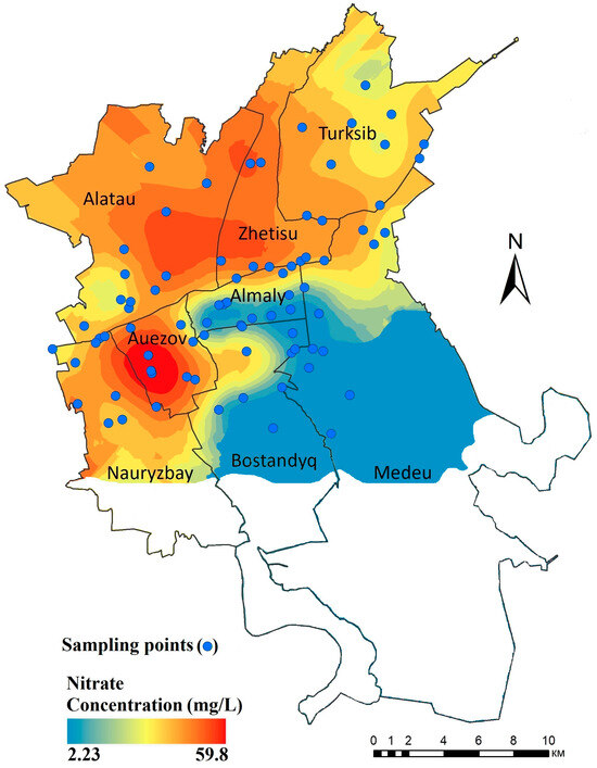 Furthermore, nitrate contamination may also be caused by inadequate sanitation facilities and infrastructure [43]. Due to rainfall infiltration, groundwater can become contaminated with nitrate from domestic effluents and sewage waste [45]. The intensive use of fertilizers [28] may also cause nitrate contamination. However, agricultural activity in the study area is not much developed. Consequently, better management of sanitation facilities is critical to reduce nitrate concentrations in the groundwater [47]. Improving and expanding sewage collection networks and wastewater treatment systems should be prioritized to improve groundwater quality [42,47,48]. It has been observed that specific districts of Almaty (Alatau, Auezov, and Nauryzbay) have high concentrations of nitrate where local inhabitants have constructed improper sewage tanks that leak into the soil and contaminate the groundwater [27].