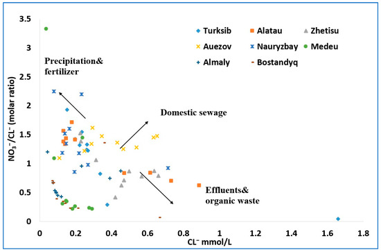 Understanding the level and origin of nitrate (NO3−) pollution is crucial in managing nitrogen health risks and advancing sustainable water management [49]. Zhang et al. [50] reported that nitrogen fertilizers, industrial discharge, municipal wastewater, animal waste, soil organic matter, and atmospheric nitrogen deposition are all potential causes of nitrate pollution in water. Numerous studies [18,20,51,52] have used stable isotope analysis, such as dual nitrogen and oxygen isotope ratios of nitrate, to identify nitrate pollution sources. Also, the sources of nitrate contamination in water have been found using relationships between nitrate, nitrite, ammonium, and chloride [42,53]. According to Liu et al. [54], chloride is not affected by physicochemical or microbiological processes that take place in groundwater, making it useful as a sewage impact indicator. Natural sources (mineral dissolution), agricultural chemicals, septic effluents, and road salt are potential sources of Cl− [54]. In practice, nitrate and chloride ions are highly related to human activities that are mostly of organic origin [41]. The examination of the NO3−/Cl− vs. Cl− ratio in groundwater may thus represent the human impact on the groundwater content and can be used to identify the various sources of nitrate in drinking water [17,54]. This method compares the NO3−/Cl− concentration ratios with the assumption that Cl− is scarcely transformed in the environment [41,54]. This characteristic suggests that when Cl− is higher than the NO3−/Cl− ratio, nitrate pollution is related to domestic effluent and sewage, whereas reverse ratios are typically related to precipitation/fertilizers [54]. The approach assumes that Cl− in the wastewater does not affect the NO3−/Cl− vs. Cl− ratio in groundwater to a great extent. Figure 3 shows the output of these calculations. High concentration ratios of NO3−/Cl− and Cl− are seen in water samples in the Auezov district, indicating that nitrate has a domestic sewage origin [17]. Drinking water samples from the Alatau, Almaty, Auezov, Nauryzbay, and Turksib districts have higher concentration ratios of NO3−/Cl− and lower Cl−, demonstrating that precipitation and fertilizers may be the primary sources of nitrate [17]. However, nitrate in the Alatau, Auezov, and Zhetisu districts may be from effluents and organic waste sources. Although the primary sources of nitrate in the Alatau, Almaty, Auezov, Nauryzbay, and Turksib districts are precipitation and fertilizers, some samples may have been influenced by the discharge of effluents and organic waste in the Alatau, Auezov, and Zhetisu districts. These observations correspond to the districts of Almaty (Alatau, Auezov, and Nauryzbay) with high concentrations of nitrate where domestic sewage and organic waste from local inhabitants contaminate groundwater sources.