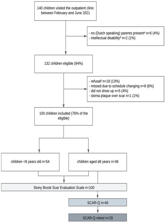 In total, 140 children with linear scars visited the outpatient clinic during the study period, of whom 132 were eligible. One child’s scar was not visible due to a stoma plaque placed over it and could therefore not be evaluated. Eighteen others refused to participate, and 13 children could not participate due to logistic reasons. Thus, 100 children (76% of eligible, see Figure 1) with a median age of 7.3 (2.5–12.1) years old participated. All skin types were represented; 24% were of color (type IV–VI). Most children (75%) had undergone a laparotomy (n = 62 transverse incision, n = 13 midline incision). Overall, surgery had been performed a median of 2.8 (0.5–7.9) years ago. A subgroup of 46 children aged ≥8 years, median age of 12.1 (9.3–16.2) years old, completed the SCAR-Q. For them, surgery had been performed a median of 8.5 (2.2–12.0) years ago. Table 1 presents all patient characteristics.