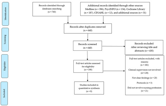 As mentioned above, four databases (PubMed, PsycInfo, Cochrane Library, and CINAHL) were searched, resulting in the identification of 760 articles. The final sample of articles was selected based on the PRISMA flow diagram (Figure 1). All articles were uploaded to the EndNote X9 software (version 9.3.3) and duplicates were removed. The initial screening of titles and abstracts led to the exclusion of irrelevant articles. Out of the 760 full articles, 190 full articles remained; however, 182 articles did not meet the inclusion criteria, resulting in a final sample of 8 articles that were included in the review (as shown in the PRISMA diagram in Figure 1 and Table 2).
