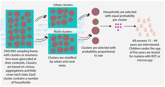 Cluster-level data from the 2010, 2015, and 2021 MIS, the 2018 DHS, and publicly available geospatial malaria covariate data were used for this study (refer to Table 1 for references). The DHS program conducts complex multistage surveys to gather and disseminate accurate, nationally representative data on health and population in over 90 countries [23]. Data collection occurs at the individual level following probability proportional to size sampling of clusters, geocoded at their centroids, and a random selection of households within these clusters [23]. For this study, only clusters classified as being situated in urban areas were retained. Figure 1 provides an overview of the DHS/MIS sampling framework. It is important to note that the DHS program intentionally displaced the GPS coordinates of the centroid of urban clusters by 0 to 2 km to ensure the confidentiality of survey participants [25]. However, the displacement is performed in such a manner that each cluster remains within the state-level boundaries. Given that the DHS exclusively collects data on children aged 6 to 59 months, the number of positive malaria tests by microscopy and the testing sample population for this age group were summarized for each cluster. The selection of covariates was guided by the relevant research literature, which highlights socioeconomic, demographic, behavioral, accessibility, and environmental factors as potential explanatory variables for malaria transmission [2,4,15,26,27,28,29]. A detailed description of all 29 considered covariates considered can be found in Table 1. To account for the distance displacement of MIS and DHS clusters when calculating values for geospatial covariates, raster values were aggregated across buffers of up to 4 km around each MIS and DHS cluster.