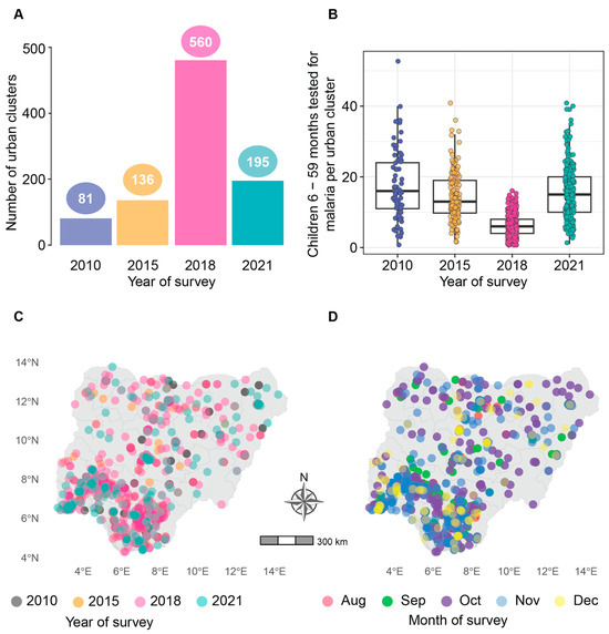 Urban clusters sampled in the 2010, 2015, 2018, and 2021 surveys: (A) number of clusters per survey year. Eighty-one clusters were sampled in 2010, 136 in 2015, 560 in 2018, and 195 in 2021; (B) number of children 6–59 months tested for malaria using microscopy per cluster and by year of survey; (C) cluster centroids mapped by year of survey within state-level administrative boundaries; and (D) cluster centroids mapped by month of survey within state-level administrative boundaries.