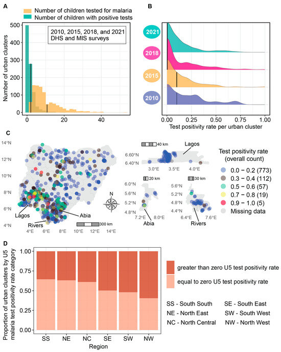 Distribution of malaria tests by microscopy, positive tests, and test positivity rates among children 6–59 months within urban clusters in the DHS/MIS 2010–2021: (A) distribution of the number of positive malaria tests (conducted by microscopy) per cluster (green); the mean = 2.9 (SD = 2.8) is depicted with a black line, and the distribution of the number tested for malaria per cluster (yellow); the mean = 10.2 (SD = 7.5) is depicted with a black line. Forty-nine percent (473) of the 972 clusters with non-missing values had zero positive tests. In all clusters, at least one child was tested for malaria; (B) density distribution of cluster test positivity rate by year of DHS survey. The thick black line is the median test positivity rate; (C) positive tests as a fraction of the number of children tested geolocated within state-level geographical boundaries. The majority of surveyed clusters in Lagos, Borno, and Akwa Ibom had a zero test positivity rate; (D) regional differences in the proportion of clusters at and above a zero malaria test positivity rate.