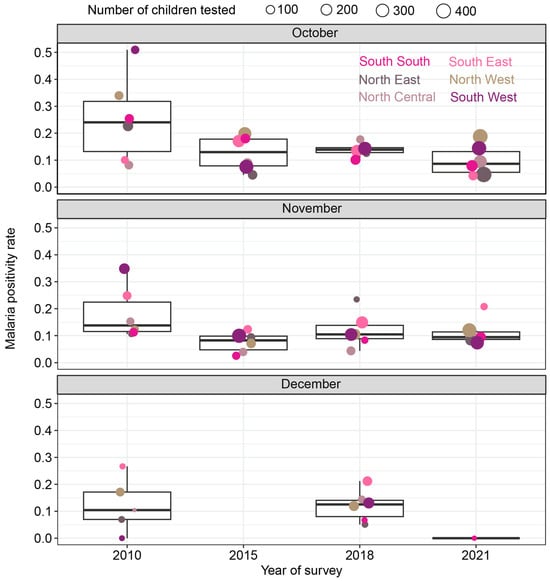 To evaluate whether the observed findings were affected by regional differences, including climate variations during the months of data collection, we analyzed and visualized malaria test positivity rates by geopolitical region for each survey month. According to Figure 4, except for the clusters sampled in December, the samples from October and November covered all geopolitical zones across all DHS/MIS survey years. While the year-over-year decline in median test positivity rates was not consistently linear, it is notable that the median rate in 2021 was substantially lower than the rates observed in 2010 in the months of October and November for all regions. However, the number of children tested for malaria varied annually. The 2021 survey featured the largest number of children tested for malaria per geopolitical region, particularly in October and December. It is uncertain whether these differences in the number of children tested account for the observed trend.