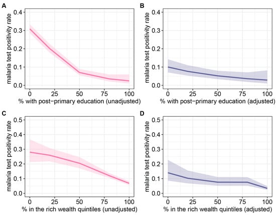 Socioeconomic variables exhibited a negative association with malaria transmission intensity, although this effect appeared less pronounced and exhibited greater uncertainty in the multivariate analysis (Figure 5A,B). The malaria test positivity rate declined with increases in the percentage of individuals with post-primary education in both unadjusted and adjusted analyses. Notably, the malaria test positivity rate displayed a consistent decline with increasing percentages of individuals with post-primary education, evident in both unadjusted and adjusted analyses. However, it is worth noting that the impact of educational attainment appeared most robust when the percentage was below 50%, as illustrated in Figure 5. Similarly, reductions in malaria test positivity rates were observed with increasing percentages of individuals falling within the rich wealth quintiles, particularly within the ranges of 0 to 50% and 80 to 100%. This trend was consistent in both the adjusted and unadjusted analyses. Notably, clusters characterized by the lowest socioeconomic status exhibited the highest risk of malaria in both analyses.