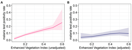 In the unadjusted analysis, there was a notable correlation between increasing the malaria test positivity rate and higher values of the enhanced vegetation index, which is indicative of vegetation cover and growth. The most substantial reductions in the malaria test positivity rate, although characterized by a high degree of uncertainty, were observed at approximate vegetation indices of 0.5 and 0.76 (as depicted in Figure 7A). However, it is important to note that the influence of the enhanced vegetation index on malaria test positivity was notably reduced in the adjusted analysis (refer to Figure 7B).