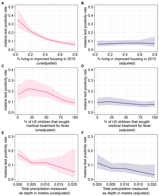 In the unadjusted analysis, an increase in the proportion of individuals residing in improved housing in the year 2015 was associated with a reduction in malaria test positivity rates. However, in the adjusted analysis, these trends appeared relatively flat (Figure 8A,B). Variables used for the adjustment were the percentage of individuals with post-primary education, the percentage of individuals in the rich wealth quintiles, all-age population density, median age, the percentage of U5 children that sought medical treatment for fevers, total precipitation, and enhanced vegetation index. Examining the relationship between the proportion of children under the age of five seeking medical treatment for fever and malaria test positivity rates, it was evident that the highest test positivity rates in the unadjusted analysis were observed at approximately 25% (Figure 8C,D). For total precipitation, during the survey month, a consistent negative relationship was observed in both unadjusted and adjusted analyses for total precipitation (Figure 8E,F). Variables used to adjust total precipitation include the percentage of individuals with post-primary education, the percentage of individuals in the rich wealth quintiles, all-age population density, median age, the percentage of individuals living in improved housing in 2015, the percentage of U5 children that sought medical treatment for fevers, and enhanced vegetation index.