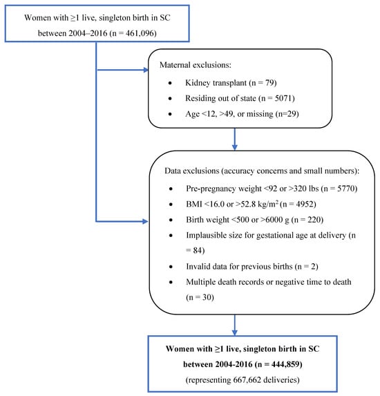Our study included women with hospitalization/ED visit data and matching birth certificate data for single, liveborn infants delivered in SC hospitals between 2004 and 2016. Maternal hospitalization/ED visit and mortality data were obtained through 2017, providing one to fourteen years of follow-up. Figure 1 shows the study inclusion and exclusion criteria. We excluded out-of-state mothers who may not seek care regularly in SC and women with prior kidney transplants who may not be representative of the pre-pregnancy hypertension and HDP exposure groups. Because of small numbers and data accuracy concerns, a pre-pregnancy weight of <92 or >320 lbs, a pre-pregnancy BMI of <16.0 or >52.8 kg/m2, newborns with birth weights of <500 or >6000 g, and deliveries with implausible size for gestational age were excluded [36].