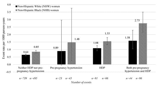 The VTE event rate (per 1000 person-years) within one, five, and fourteen years in women with HDP was higher in NHB women (1.99, 1.55, and 2.11) than in NHW women (1.46, 1.08, and 1.33), respectively. Similarly, the VTE event rate (per 1000 person-years) within one, five and fourteen years in women with both conditions was higher in NHB women (4.29, 2.75, and 3.07) than in NHW women (2.14, 1.58, and 2.12), respectively. Figure 2 presents race-specific incident VTE event rates per 1000 person-years (95% CI) for NHW women and NWB women within five years of delivery.