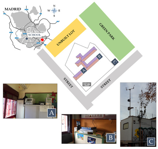 Three different sampling points were considered for this study: two classrooms (A and B) and an external checkpoint (C), located by the fence outside the school grounds, in a mobile air quality monitoring unit provided by the Madrid municipal authorities (Figure 1, bottom panel). The classrooms were located on the first floor of a three-story building with windows oriented to a closed schoolyard. Thus, they were selected not only as being representative of the occupancy in the building but also for analyzing the influence of traffic emissions on IAQ in detail, while sampling point C, close to the street, was selected as representative of the outdoor air quality levels. The distance between the three measuring points was between 30 and 60 m above ground level (a.g.l.), and all of them were located ~3–4 m above street level. Both classrooms are usually occupied by students during school hours and days. In addition, the case of classroom A was naturally ventilated by opening windows on 27 (09:30–10:15 and 13:00–13:44 UTC), 28 (10:45–13:05 UTC), 29 (11:30–13:00 UTC) and 30 (11:30–12:50 UTC) November, and 1 (09:00–10:24 and 12:20–13:05 UTC), 4 (07:55 and 10:45–11:30 and 12:20–12:50 UTC), 05 (07:50–08:55 and 13:23–13:51 UTC), 13 (10:30–11:00 UTC), 14 (09:30–10:10 and 11:30–13:50 UTC), 15 (09:10–09:31 UTC), 18 (10:50–11:30 and 12:15–13:40 UTC), and 20 (08:02–09:07 and 12:20–12:50 UTC) December.