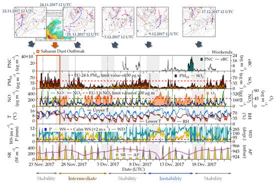 Atmospheric instability periods: A period (9–17 December 2017) of atmospheric instability conditions occurred during the experimental campaign. This was characterized by the influence of a low-pressure system (Figure 2) and higher wind speeds, up to 13.6 m s−1. A precipitation event was registered on 11 December 2017, accumulating 10.6 mm (Table S1). These high dispersion conditions allowed a greater dilution of pollutants, which, along with wet deposition, reduced the PM10 concentrations and traffic emission gases in the surface layer. Thus, the daily average concentrations of the different pollutants measured were lower than those for the stability periods; in this case between 7 and 21, 2 and 6, 2 and 70, and 14 and 62 µg m−3 for PM10, SO2, NO, and NO2, respectively. In this period, the O3 concentration was higher, as shown in Figure 2, given that NO levels were low during the period and O3–NO titration did not occur.
