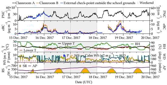 Upper panel: Simultaneous time series of outdoor PNC and eBC measured at the three sampling points. Lower panel: Temporal variation of meteorological parameters (upper and lower temperature (upper and lower T, respectively), relative humidity (RH), wind speed and direction (WS and WD, respectively), precipitation (P), solar radiation (SR), and atmospheric pressure (AP)) obtained at CIEMAT site during the period 15–19 December 2017.