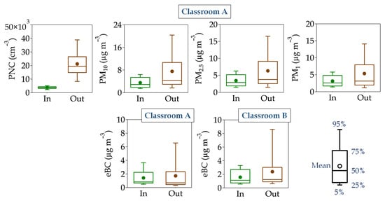 Box plot of 10 min indoor and outdoor concentrations for all pollutants (PNC, PM10, PM2.5, PM1, and eBC) measured in the two classrooms (A and B) during a non-occupancy (weekend) period (from 15 December 2017, at 21:10 UTC to 17 December 2017, at 20:10 UTC) with all available data. In the graph, the prefix “Out” refers to outdoor, whereas “In” indicates indoor measurements.