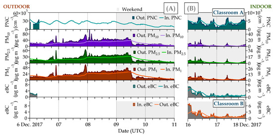 Simultaneous time series of indoor/outdoor (I/O) pollutants (PNC, PM10, PM2.5, PM1, and eBC) measured at classrooms A and B during two non-occupancy periods (weekends and vacation), from (A) 6 to 11 December 2017 (left panel) and (B) 16 to 18 December 2017 (right panel), with stable and ventilated atmospheric conditions, respectively. In the graph, the prefix “Out” refers to outdoor, whereas “In” indicates indoor measurements.