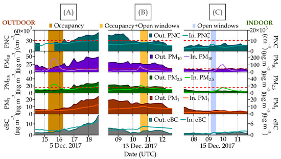 Simultaneous time series of indoor/outdoor (I/O) pollutants (PNC, PM10, PM2.5, PM1, and eBC) measured at classroom A. Examples of the three different activities in the classroom considered in this study are (A) an occupancy period, (B) a window-open period during occupancy, and (C) an open-window period without occupancy. The red dotted line in PNC represents the optimal detection range of the indoor CPC (0–1 × 104 cm−3), in PM10 this dotted line represents the WHO 24 h standard of 45 µg m−3, and in PM2.5 it represents the WHO 24 h standard of 15 µg m−3 for indoor ambient air levels. In the graph, the prefix “Out” refers to outdoor, whereas “In” indicates indoor measurements.