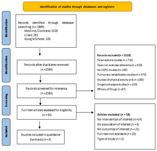 The associated MeSH terms used were “Pulmonary Disease, Chronic Obstructive,” “health” OR “mobile app,” and “medication adherence.” Following an exhaustive search, additional words, synonyms, and exclusion operators were considered (Table S1). We conducted a comprehensive literature search using electronic databases, including Cochrane Database of Systematic Reviews, Medline, Lilacs, and Google Scholar from inception to February 2023. Two independent reviewers (Machado B and Cortes K) conducted the initial screening of titles and abstracts based on the predefined inclusion and exclusion criteria. Discrepancies between the reviewers were resolved through discussion, and a third reviewer (Bustos RH) was consulted if consensus could not be reached. Data extraction was performed by the two reviewers using a standardized data extraction form in Excel (Microsoft. Excel, 2016, Redmond, WA, USA).